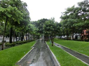 ホテルを出て目的地への途中の道は、大通りの間に挟まれた緑地帯の草悟道を歩いたりしました。雨に濡れた緑が綺麗。でも、雨、そして、すごい湿度です。