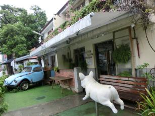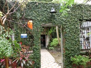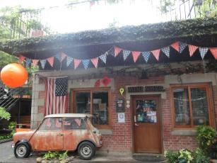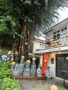 ガジュマルの木の下にモアイ像のあるお店は“旅禾泡芙之家”とあるので検索したところ、食べ物系のお店らしいです。