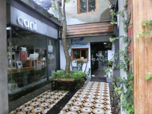 ↙ の戸口の中をのぞくと、↓ のように、複数のお店があるのが見て取れました。外観はクラシカルでも内部はオシャレ。