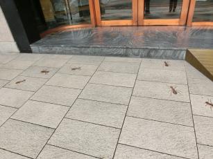 新駅舎への階段に造られている緑の葉とそこに泊まるトンボの巨大オブジェがインパクト大です。