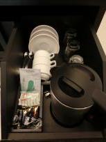 備え付けの湯沸かしポットとティーセット →。