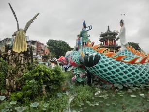 龍の塔の上部から蓮池潭と、蓮池潭を挟んで龍虎塔のお向かいにある慈済宮を眺めたり、方向を変えて、春秋閣や五里亭、北極玄天上帝像を激写したりと大忙し。