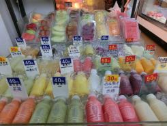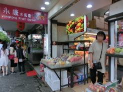永康街に永康水果園という水果店がありました。こちらのお店では、マンゴーがカットされてパックに入って売っていました。生のライチも束で販売。