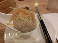 小龍包をレンゲに乗せ少量の生姜をトッピングしていただきます。熱々ジューシーでおいしい。ただ、2013年は1人分が5つだったのが、2019年では1人分が4つです!