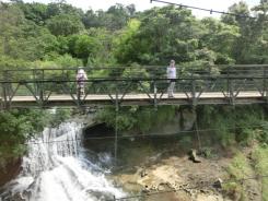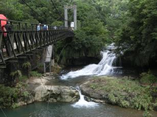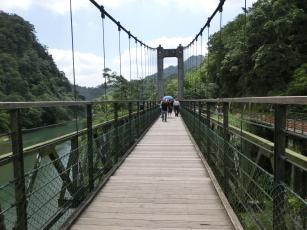 10時05分、先ほど乗車していた平渓線の車窓から見えた吊り橋を渡ります ↓。写真向かって右端が平渓線の線路(鉄橋?)。列車に乗って通過した線路の場所に約30分後に徒歩で戻ってきました(^^)v