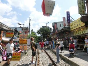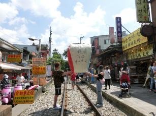 十分瀑布公園のセンターから、来た道を約10分歩くと → の天燈上げが見える十分老街に到着。