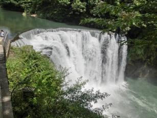 平渓線沿線の緑溢れる景色を楽しんでいると、十分瀑布の滝が見えてきました。そうすると間もなく十分駅に到着。