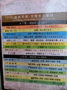 ← 天燈の色と、その色の意味を書いた日本語の説明文があるので、その場で色を決めるときに助かりました。私たちは、じ~っと見て&考えて、赤(健康)・黄(金運)・青(仕事運)・ピンク(幸福)の4色セット200元(約800円)の天燈にしました。