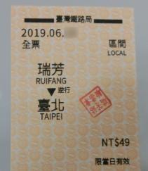 のメモを窓口係員さんに見せました。英語で話しかけたのは、英語対応していただくため。駅員さんからは各駅か急行か尋ねられ、各駅利用を伝えた後、最終的に「Today?」と確認され、「Yes,today」と答えて無事に台北と瑞芳の往復の乗車券を購入。98元(約400円)×2名分。