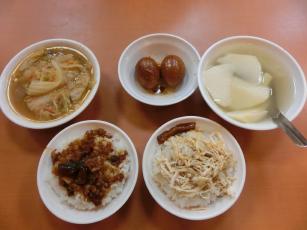 鉄板の魯肉飯の小30元(約120円)と鶏肉飯の小35元(約140円)、滷蛋(ゆで卵)2個10元×2(約80円)、魯白菜50元(約200円)と竹筍排骨湯(タケノコとスペアリブのスープ)50元(約200円)の合計185元(約740円)を注文。