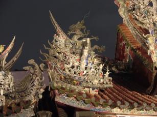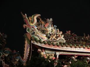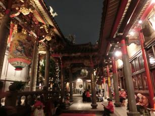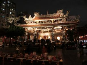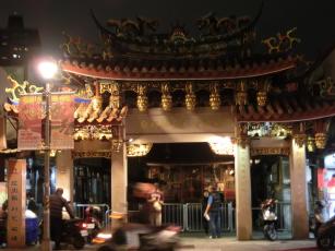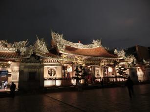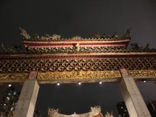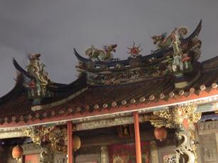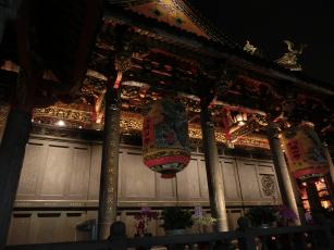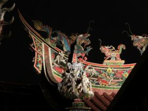 龍山寺前殿。屋根に鳳凰や龍などの縁起物の彫刻がたくさんあったのは覚えています。でも、こんなにすごかったでしたっけ?昼間に見るのと夜にライトアップされ、闇夜に浮かび上がったものとでは、受ける印象が違うのでしょうか。ことさら素晴らしく感じます。