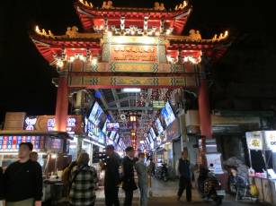 すると、突然、艋舺夜市の通りの右手に、キラキラしい華西街夜市の門が出現。