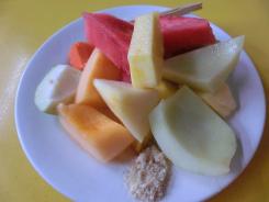 パイナップルが甘~い♪スイカも他のフルーツも水分たっぷり。薄いパステルグリーのフルーツは硬い…これは一体??