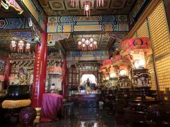 約60年前の建物。柱の透かし彫刻など、力作揃いでキラキラしい凌霄寶殿。