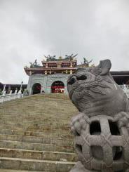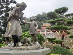 南天門を通り越してすぐのところにあるちょっとした庭園のような慈母園があります。そこにあった親子の像と母親像の足元に佇む黒猫なめに凌霄寶殿を撮影。