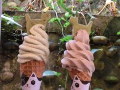 猫の形のクッキー付きの文山包種茶と木柵鉄観音茶のソフトクリーム各90NTD(約450円)をそれぞれ1つずつ購入して、店内で食べます。