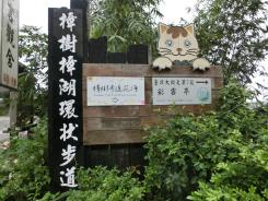 雲が多少多めながら、快適な気温での樟樹歩道の散策も、終盤に入っています。少し歩くと樹林帯に入り、猫さんが持つ樟樹歩道と樟湖歩道の案内図があります。それによると、現在地は樟樹歩道のもう一方の端まで、あと5分の1くらいの距離のようです。