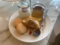 2段目のお皿が最もお腹に貯まる系と思われるマカロンとワッフル、ババロアとゼリーです。ゼリーは何のぜりーだったのか?もう、すでに記憶の彼方に消えています。それほど印象のないお味だったのでしょう。