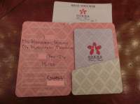チェックインが終わり、パスポートを返却され、カードキーと翌日から3日間の朝食券を受け取ります。 右の写真の出入口奥→が、朝食会場だと案内されてから、解散。