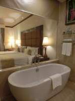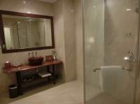 部屋からバスルームはガラスで仕切られてて、部屋に入ったときはバスルームが部屋から丸見え。これ、近年のリゾートホテル?の流行りみたいです。何方の趣味?