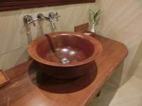 洗面ボウルが陶器製?と思って近づいてみたら木製でした。木製の洗面ボウル。初めて見る代物です。