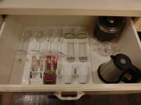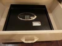 引き出しの1段目にはポット、コーヒー・紅茶とカップ類。2段目にはセーフティボックス。