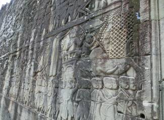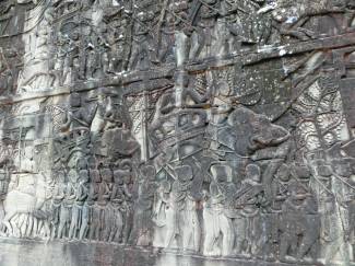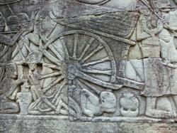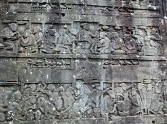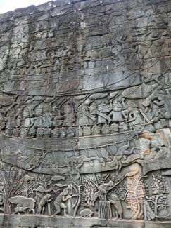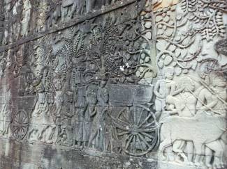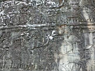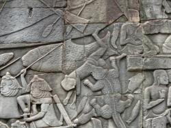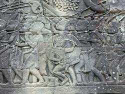 レリーフの耳たぶが長い人々がクメール人、髭を生やしていて髷を結っているのが中国人だそうです。右→や下の写真の兵士さんたち↓は耳たぶが長いので、クメール人です。