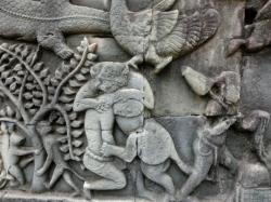こちらに描かれている皆さんは髷を結っているよう↑ですので、中国人の方々が宴会を催しているレリーフのようです。 ←船上での戦いで敗れて水中に落ちてワニに噛まれる兵士→と下段には虎に追われて木に登って逃れようとする人間の姿←が彫られています。