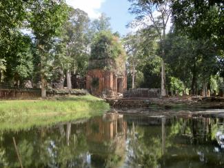 すると、戻る途中、環濠の対岸にプラサット・クラハム発見。逆さプラサット・クラハムが環濠の水面に映り、物凄く映えます。