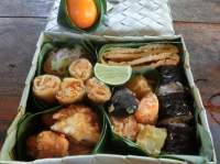 下の写真向かって右端の黒い物体↓は、ノリが巻いてあるご飯。おにぎりと思って一口。全く塩気なし、具もなし。おにぎりでもなくお寿司でもなく…これは、一体?。