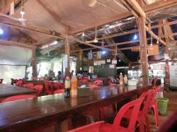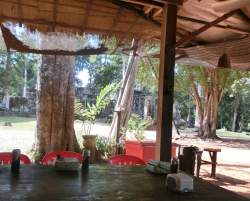プラサット・トムに向かって左側の一番遺跡側の食堂?前に案内され、ガイドさんから「ドリンクはジュース1ドル(約160円)、ビール2ドル(約320円)です。好きなものを選んでください。」と言われます。