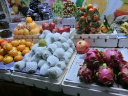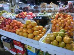 果物店の店先には、日本ではあまり見かけない南国ならではの果物が並んでいるかと思えば、柿やミカンなど、お馴染みの果物も並んでいます。