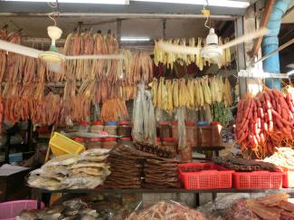 食料品店は、これは地元の方向けの魚介類のお惣菜、という感じ?店頭にこの置き方は…。