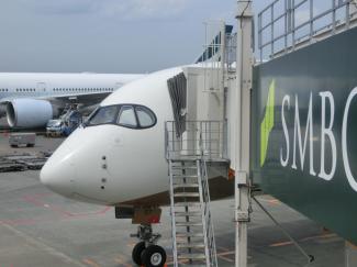 遅延か?と、ちょっと心配になりつつ窓の外を見ていると、12時45分ころ、スターラックス航空機到着。