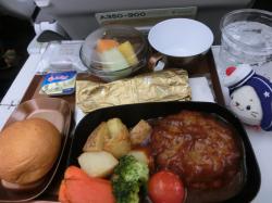 機内食のメインは煮込みハンバーグとローストポテトorサーモングリルと五目御飯。他は共通で、ソフトロール(パン)、季節限定のサンドイッチクッキー、季節のフルーツ。