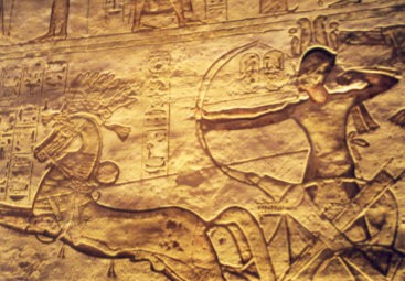 ![]() アブシンベル大神殿内部 ヒッタイトとの「カディシュの戦い」の模様を描いた壁画 |