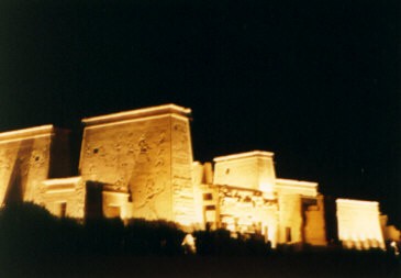 | 夕食後、希望者のみが実費でフィラエ島へ、こちらもダム建設時に移築されたイシス神殿の光と音のショーを見に行く。 今回はツアーのメンバーのうちお一方を除いて全員参加。 日本人がいわゆる”光の音のショー”に抱くイメージとはかけ離れていて、レーザー光線とか飛び交うのかと思ってたら男神と女神の声のドラマに合わせて照明が変わり神殿が浮かび上がり、ときおり効果音が入る朗読劇(?) しかも日本語はなく、見学したのは英語バージョン。 イシス女神は英語だとアイシスなんですね〜。妙に感動。(笑) イシス神殿のライトアップを見たと思えばよいのか。(笑) |