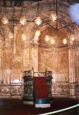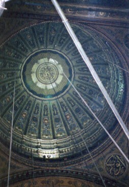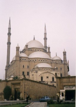 | アスワンからカイロへフライト。爆睡。 振り出しのカイロ空港に戻って来た。成田へ向う便は夕方のため、カイロ市内観光へ出発。 本日のテーマはイスラム世界のカイロ。 シタデルの外でバスを降り、徒歩にてモハメッド・アリ・モスクへ。 2本のミナレット(鋭塔)が印象的なモハメッド・アリ・モスクに入るときは、靴を脱いで入りましょう。生まれて初めてのイスラム寺院は、キリスト教の教会と驚くほどは異ならない。照明の作りが一種独特で幻想的かな。 |