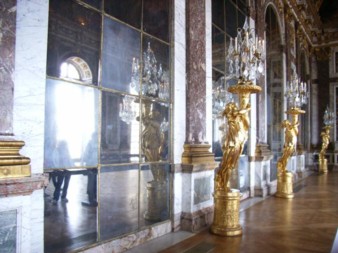 鏡の間は2005年5月当時、修復工事中のため、半分以上(2/3近く)覆いがされていたので、これを主目的にしてる方がいらしたらショックかも。パンフレットに“工事中で覆いあり”の注意書きがあったけど、予想以上に覆いがされている面積が広かった。 |