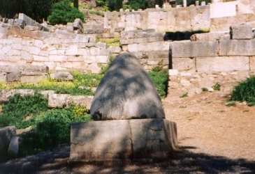 世界の中心と考えられていた「へその石」が置かれていた場所。オリジナルはデルフィ博物館に置かれている。 デルフィ博物館横の郵便局で切手を2枚買ったら、当時、流通間もないユーロでの計算に窓口のおじさんがまごまご。もう慣れたかな。 |