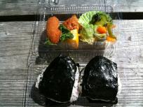 おにぎりがコンビニおにぎりの約1.5倍とジャンボサイズ。(笑) そしておかずの彩りが綺麗♪