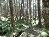 駐車場から白駒池までは、林の中の緩やかな上り坂。林は程よく陽が遮られ、苔が密生していて、雨上がりだとさぞ、苔が生き生きとして美しいだろうと思わせます。ちょうど、このときは、あまり雨がなかったのか、少し瑞々しさが足りないかなぁ?