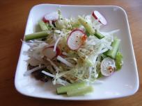 サラダのドレッシングが何が効いているのかピリ辛で美味しくて、進みます。パンは温めてあってもちもちしていてgood。