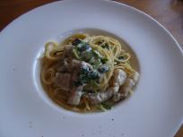 スパゲティもパッと見、量が少なめに見えますけれど、実はなかなかのボリューム。お肉も脂身がたっぷりだけど、全然気にせずとろっといただけました。