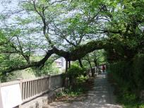 写真→向かって左側に川が流れています。奇妙な形をした木は桜の木のようです。日光を求めて川のほうへ張り出しているのでしょうか。桜の時期に散歩するのも良さそうな散歩道でした。