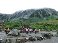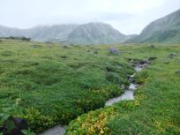 降りしきる雨の中、みくりが池周遊コースをかなり高いテンションで歩きます。でも、立山の山頂は雲の中。立山さん、顔を見せてくれないかなぁ。