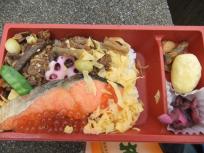 お弁当を広げると、リュックに背負っていたのですっかり片寄ってしまっていました。でも、このお弁当がおいしかったのです。ツアーで手配したお弁当とは信じられないくらい。いくらが入っているとは思わなかったし、牛肉も鮭もご飯もおいしかったです。大絶賛。