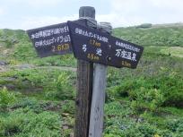 コマクサや他の花を眺めながら、比較的ゆるい勾配を下り、更に進むと11時10分に、本白根山展望場所と本白根山遊歩道最高地点の分岐に差しかかりました。