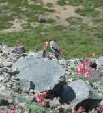 するとすぐにコマクサの群生地があり、そこで、→の小鳥さんがいました。何て鳥なのでしょう?よくよくこの小鳥の行動を見ていると、コマクサの花をついばんでいるように見えます。小鳥がコマクサの花を食べるのですか?!驚きです。