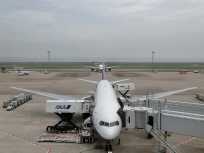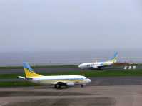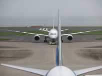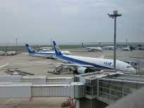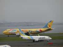 | ピカチュウジャンボが姿を現すと、隣りの席の4人家族のお父さんが望遠レンズを付けたデジイチでピカチュウジャンボを激写し始めました。もしかしたら、空男さん? ポケモンジェットが目の前向かって左側の駐機場に入って少しすると、あちこちで4機の航空機が同時に動き出しました。 |